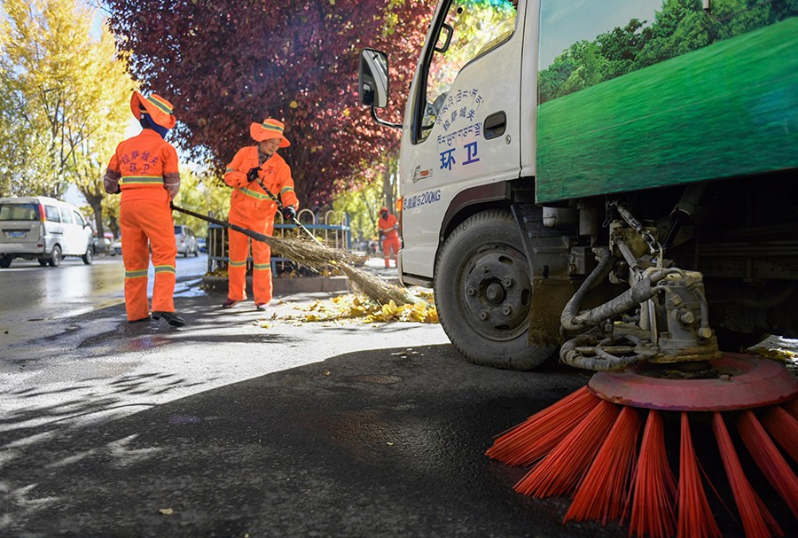 时下,冬季来临,拉萨城的街道上满是落叶,一阵风吹过,落叶卷着尘土翻飞起舞,不仅影响行人及车辆的通行,而且堆积过量容易造成下水管道堵塞。拉萨市城关区洁达环卫保洁有限公司清扫大队领队告诉记者,拉萨每年的11月至12月落叶最多,环卫作业量大幅增加。为减轻环卫工人的工作量并保持路面整洁,环卫公司采取“人机”配合的作业模式,对拉萨城区主干道落叶进行清扫,收效明显。据了解,有些街道非机动车占道问题影响环卫工作,望广大车友主动挪车,配合清扫,使冬日拉萨更美更清洁。图为拉萨市城关区洁达环卫保洁有限公司环卫工人与环卫车辆在娘热路上进行落叶清扫作业。